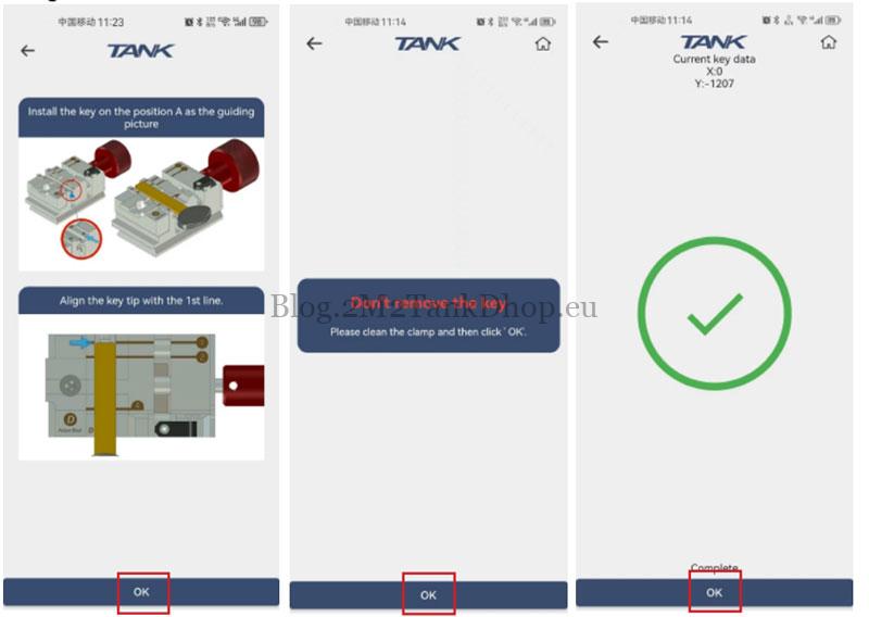 - Remove any debris and press “OK”. (Keep the key clamped in place.)