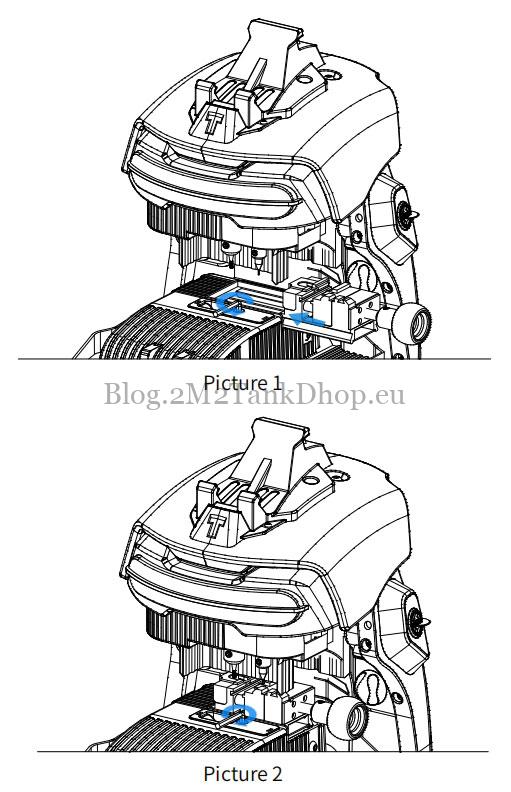 - Unscrew the lock for the 2M2Tank Clamp, insert the clamp along the rail depend on the arrow(picture 1).