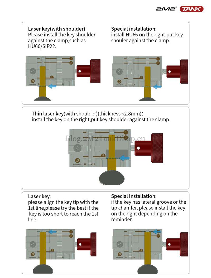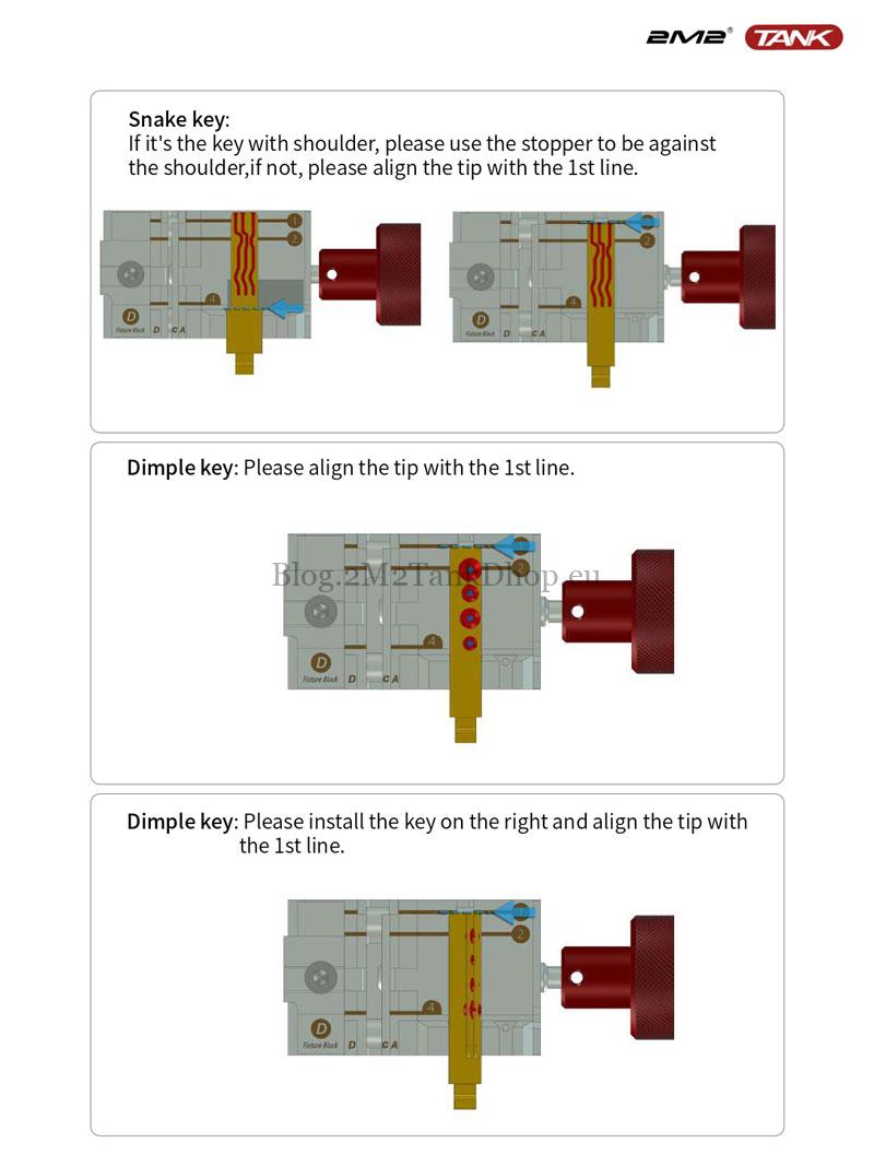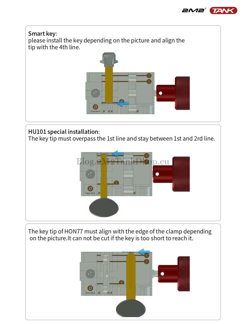 This quick guide explains how to install the cutter, probe, clamp, and keys for your 2M2Tank Key Cutting Machine system. Follow the simple steps for each part, and refer to the included pictures for visual help.